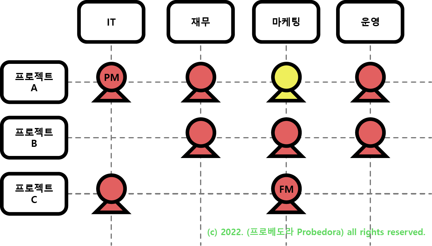 프로젝트를 직접 관리, 감독합니다. 많은 권한이 주어짐으로 강한 매트릭스 조직에 속합니다.