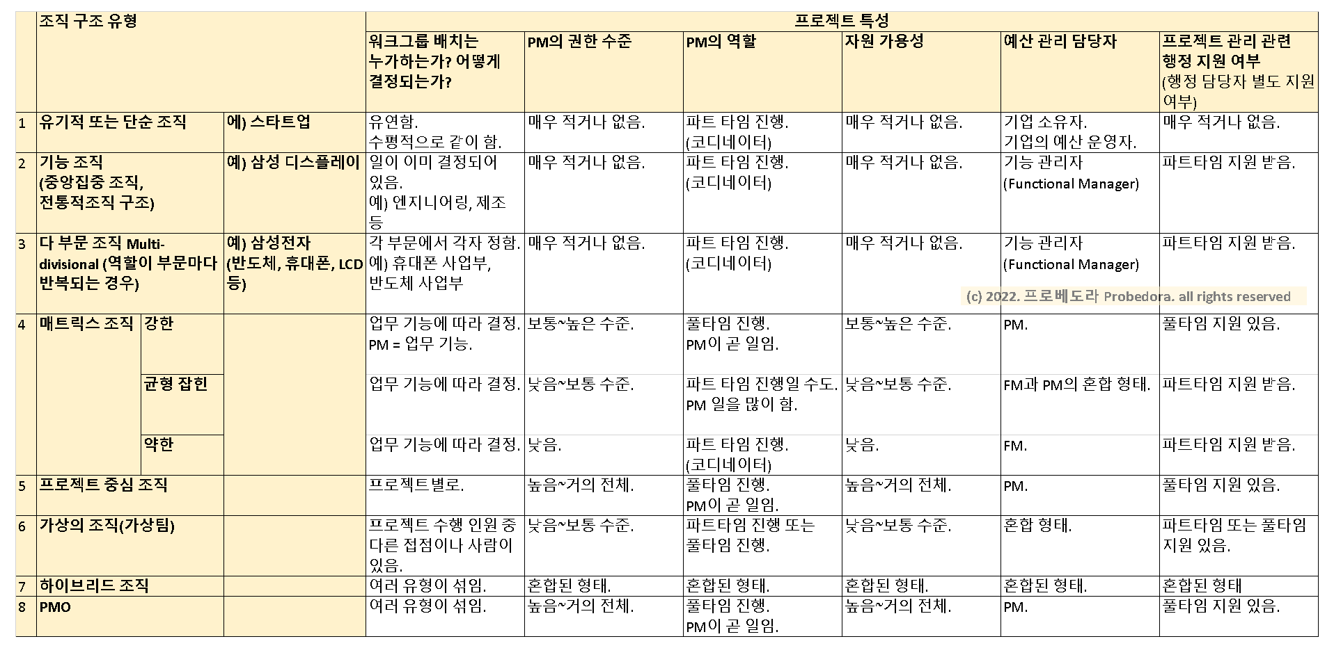 기업의 전사 프로젝트 전담 조직으로, 프로젝트 관리 능력을 향상시키고 발전시키기 위한 실질적인 관리 역할과 역량을 제공합니다. PMBOK에서는 PMO의 유형을 세 가지로 정리하고 있습니다.